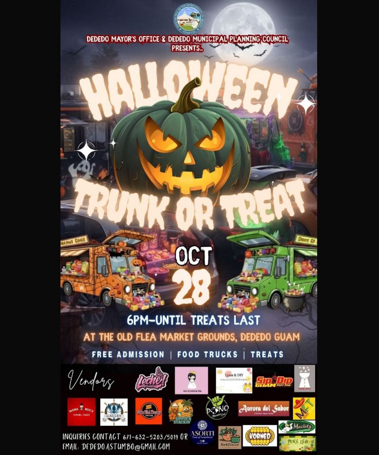 Bring the family out for a spooky good time at Dededo’s Halloween Trunk or Treat! Enjoy decorated trunks, food trucks, and plenty of treats in a safe and festive environment.