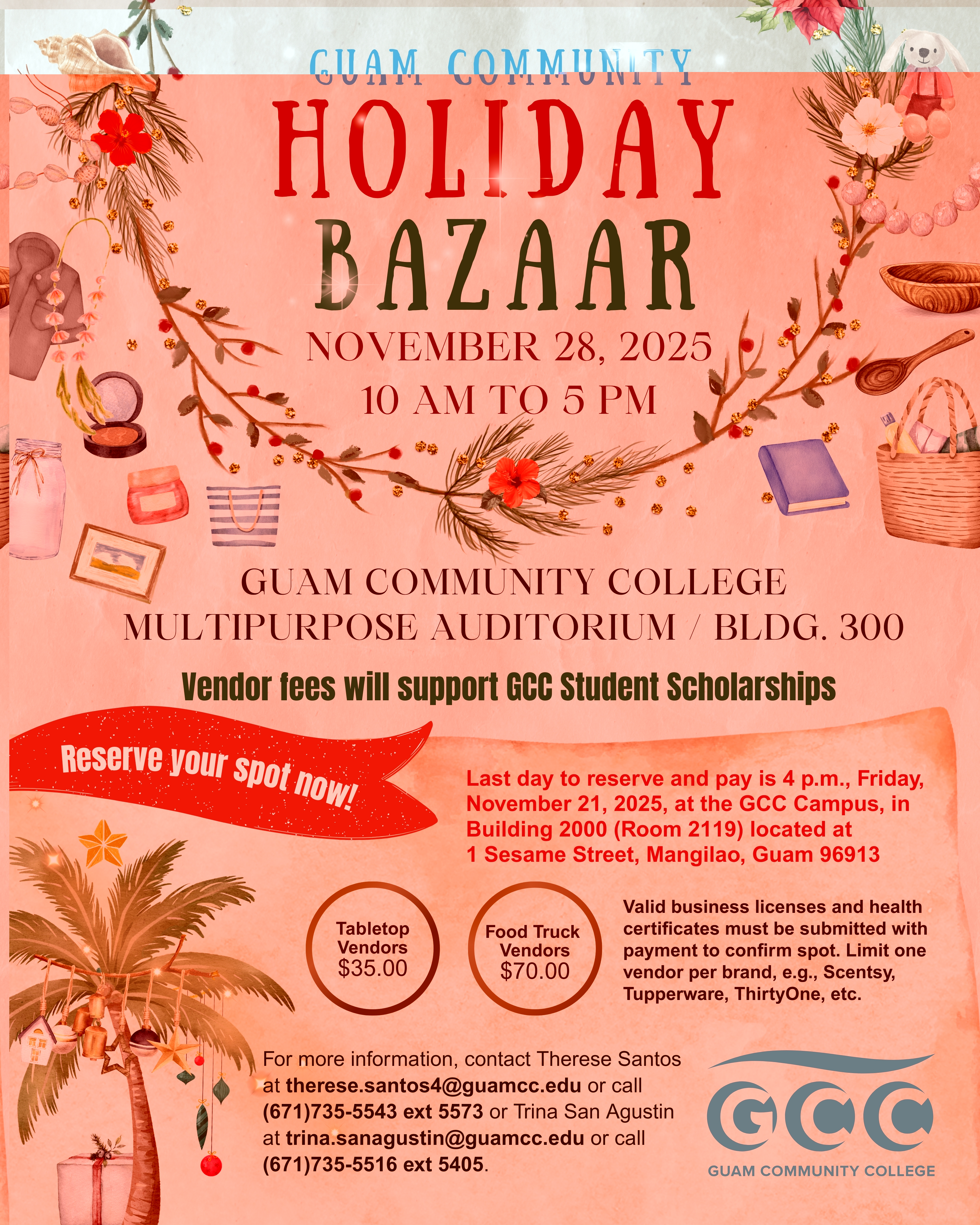 Guam Community College invites local vendors and food trucks to join its Holiday Bazaar on Black Friday! This festive event builds on the success of GCC’s “Christmas in July” Bazaar and offers a great opportunity for local entrepreneurs to showcase their products while supporting GCC student scholarships.