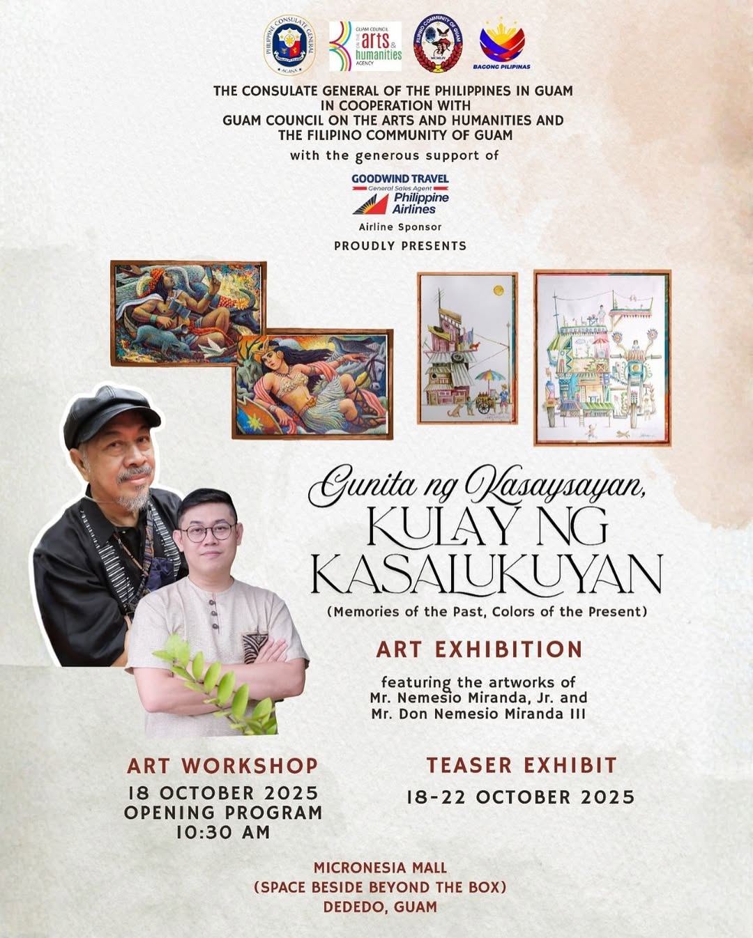 Celebrate Filipino heritage and creativity at Gunita ng Kasaysayan, Kulay ng Kasalukuyan (Memories of the Past, Colors of the Present), an art exhibition and workshop featuring the works of renowned Filipino artists Mr. Nemesio Miranda Jr. and Mr. Don Nemesio Miranda III. This cultural event highlights the vibrant connection between history and contemporary Filipino identity through visual art.