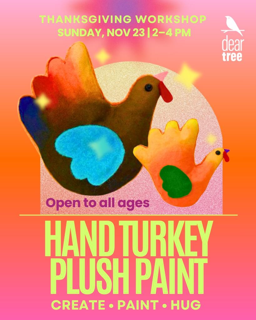 Celebrate the season with a cozy, creative Thanksgiving activity! Paint your turkey design, trace your hand as the pattern, then cut, sew, and bring your plush turkey to life. A pluffy keepsake of your little one’s handprint!