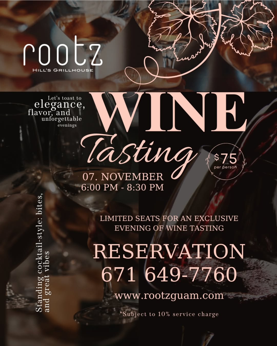 Join Rootz Hill’s Grillhouse for a standing cocktail-style wine tasting experience featuring curated bites, elegant pours, and great vibes. This exclusive evening is designed for wine lovers and those looking to unwind in style.